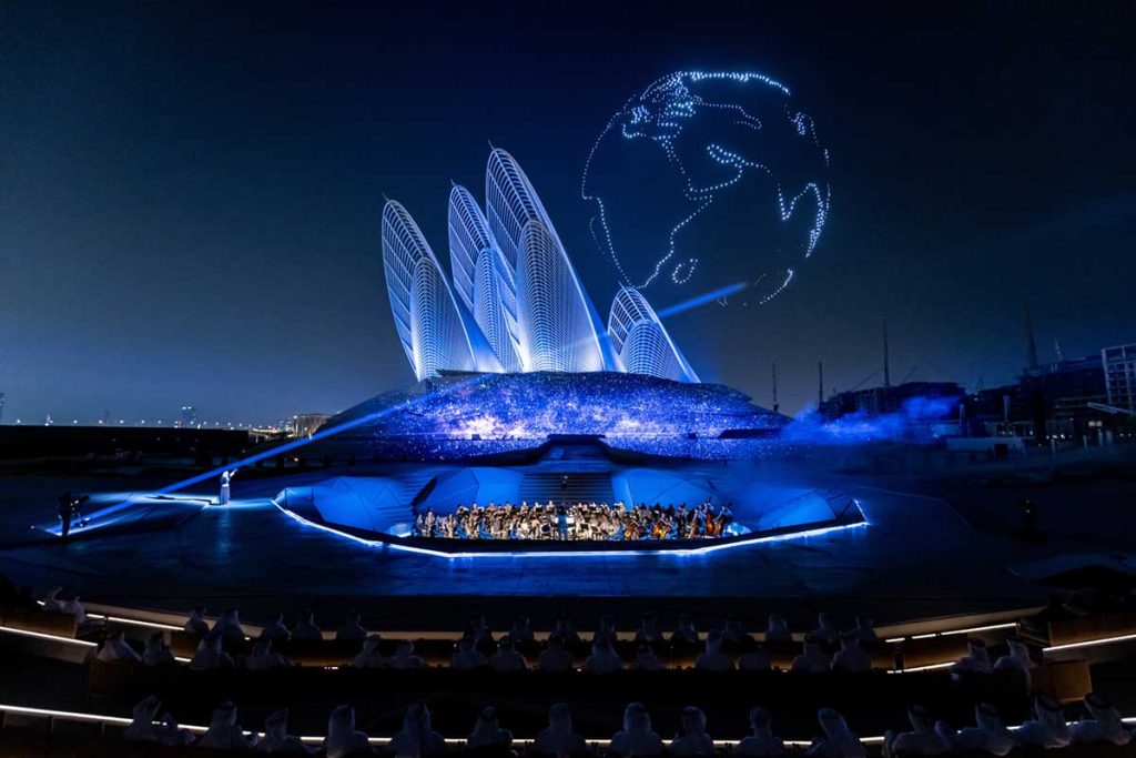 With the pit accounting for foreground action, the production was given a sense of scale thanks to the giant wings of the Sheikh Zayed Museum, which was highlighted through lighting and augmented through an accompanying drone show. “It really accentuated the story,” Elliot recalled, describing the multilayered nature of the show site. “This was the greatest example of up-and-down production we’ve ever experienced in a show.”