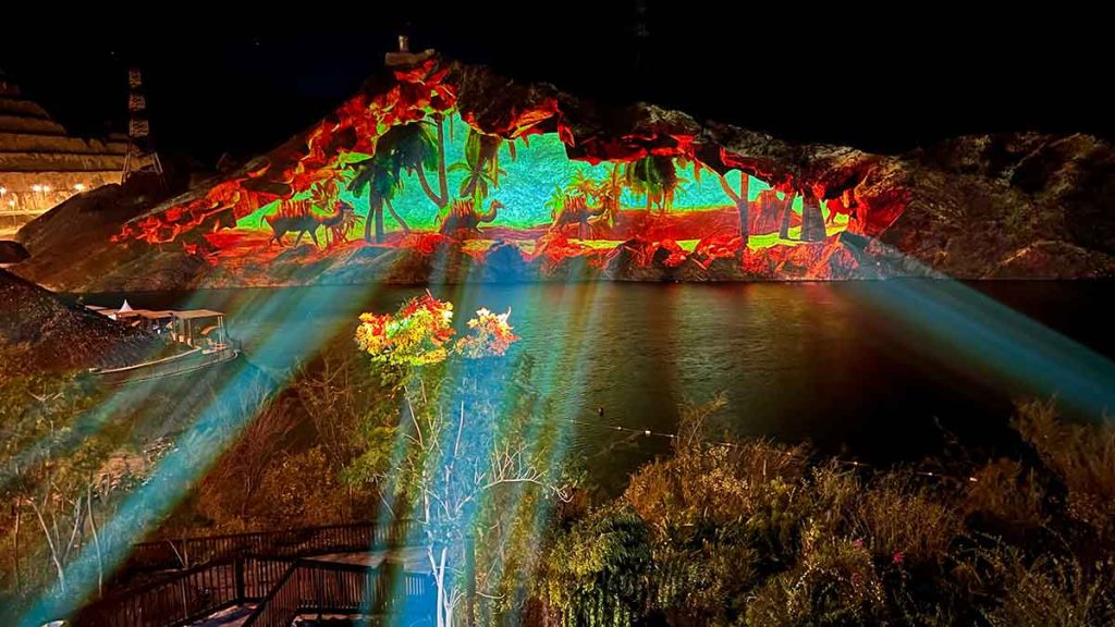 Entitled The Jewel of Al Rafisah Dam, the 3D projection mapping show was inspired by the ‘Golden Age of Sharjah’, focusing on the ancient history of the city of Khorfakkan and the UAE’s native flora and fauna. At its climax, 12 swans emerged from the mountain behind the dam and danced on the waters of the Wadi Shie river.
